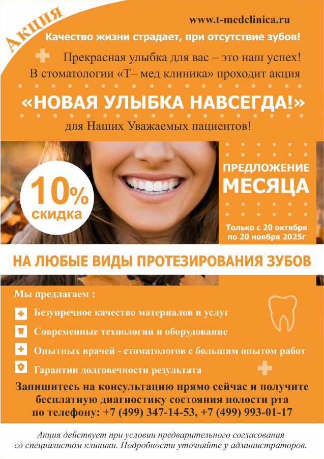 Записаться на консультацию в доступную стоматологию "Т-МЕД КЛИНИКА" можно по телефонам: +7 (499) 347-14-53, +7 (499) 993-01-17 или через форму записи на сайте.